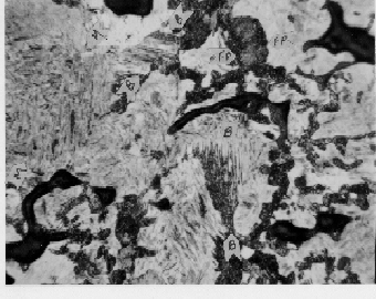 Partially hardened pre-alloyed steel, normal sinter. M=martensite, B=Bainite, FP=fine pearlite and P=pore.