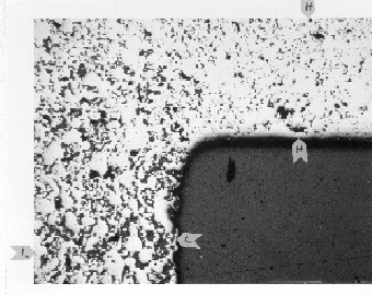 Unetched structure. Density variation in a flanged P/M part. The radius shows that this was compacted in a shelf die.The shelf region on the right, H-H, is substantially higher in density than the barrel, lower left, L-L.
