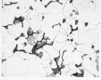 Pre-alloyed 4600 series steel, with enough graphite added to produce 4605. Arrows E-E surround eutectoid, arrow F shows ferrite grain boundary and P=Pore. Note the wider spacing of the carbide platelets in the eutectoid, vs. the spacing seen in pearlite in unalloyed iron.